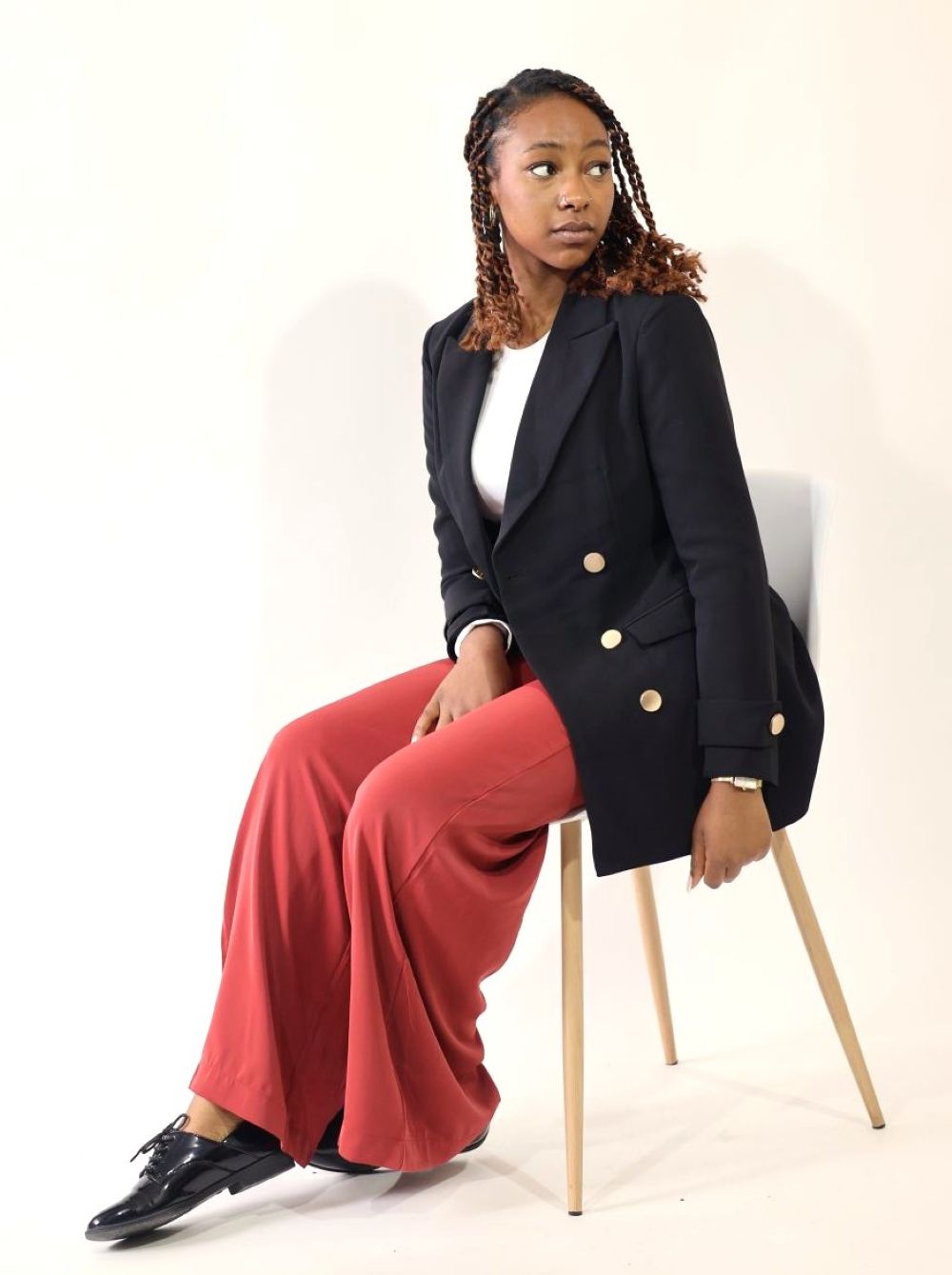 Le palazzo GINA brique se porte idéalement avec une blouse écrue ou beige pour adoucir la couleur, ou avec un blazer noir pour une allure sophistiquée. Complétez la tenue avec des sandales dorées ou des escarpins nude pour sublimer vos jambes.