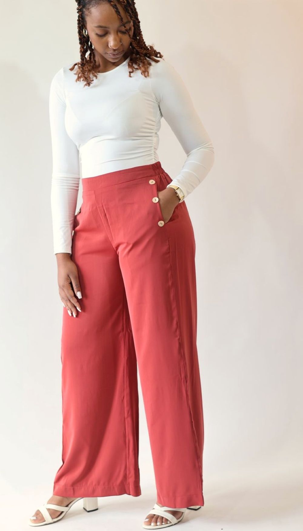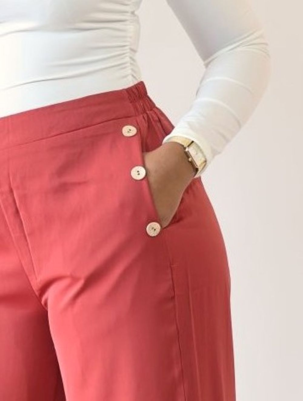 Soyez le premier à laisser votre avis sur “Pantalon Palazzo Brique fluide femme avec boutons dorés – Modèle GINA”