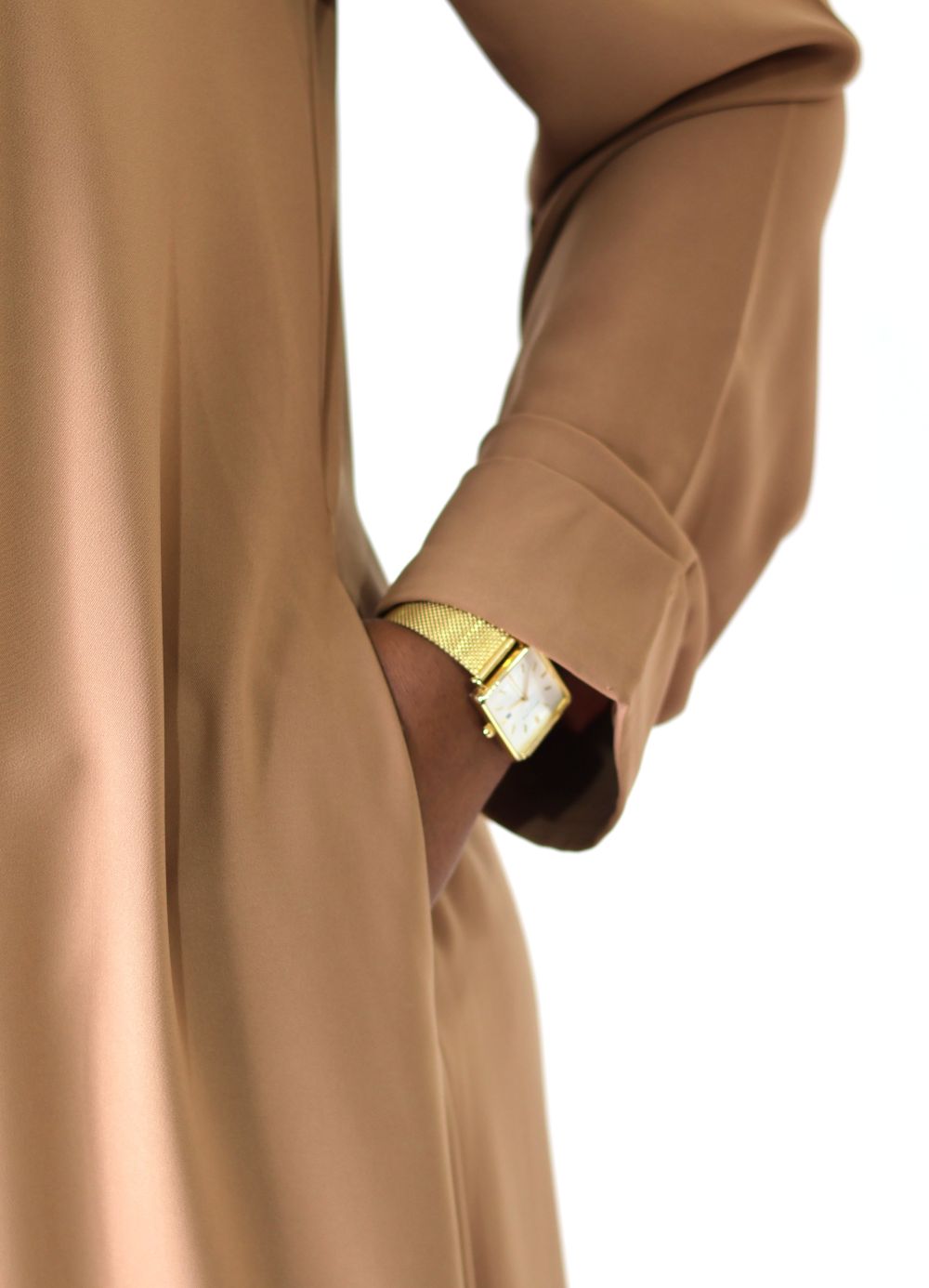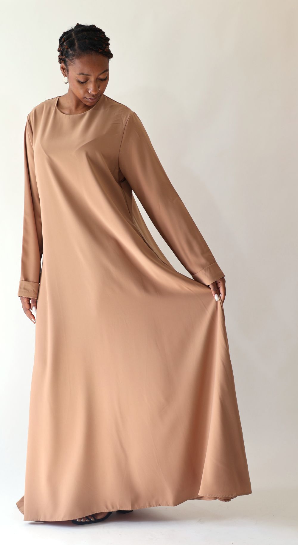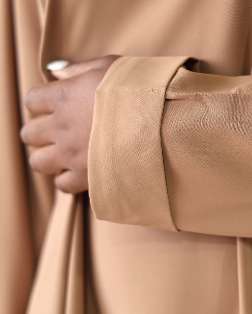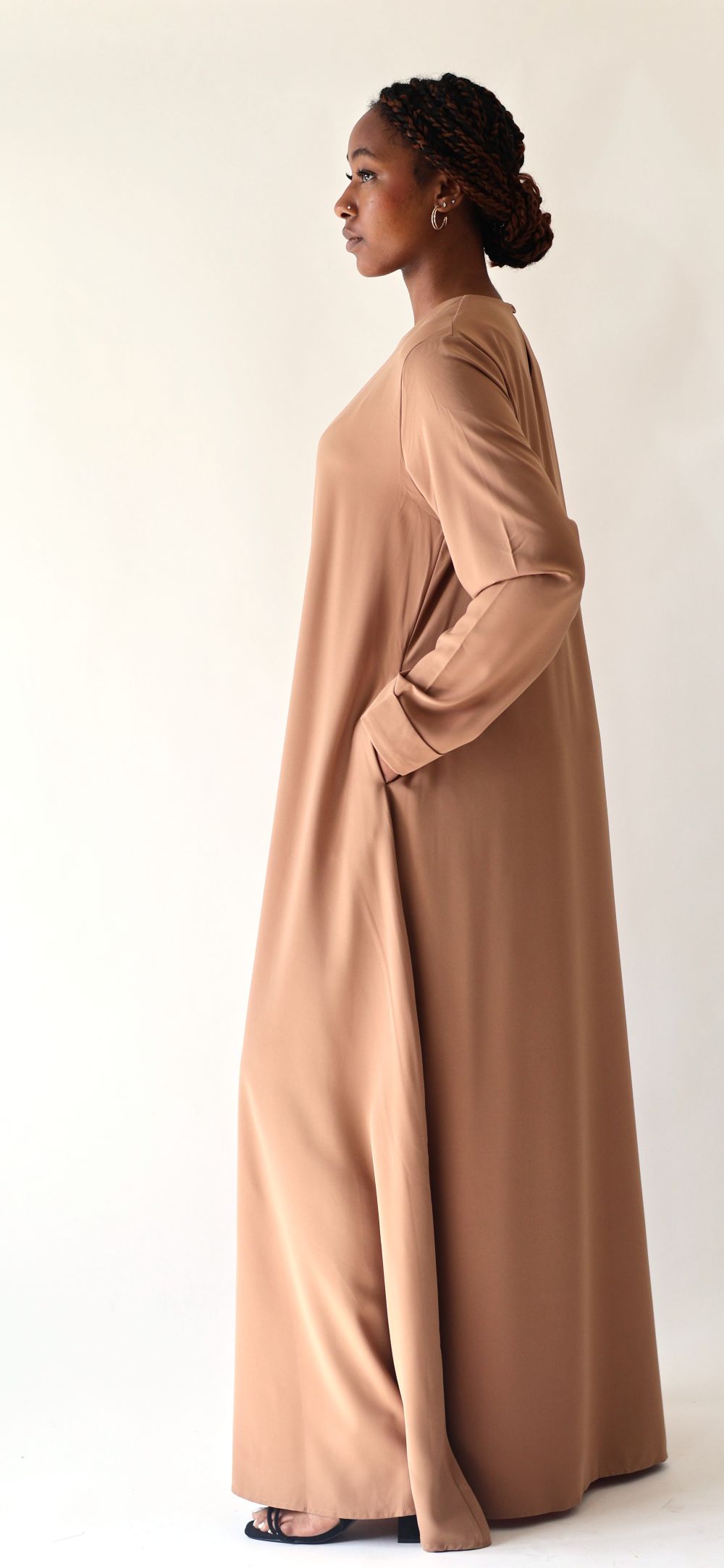 Abaya Beige – Abaya longue évasée col rond avec poches discrète – Modèle Aliya