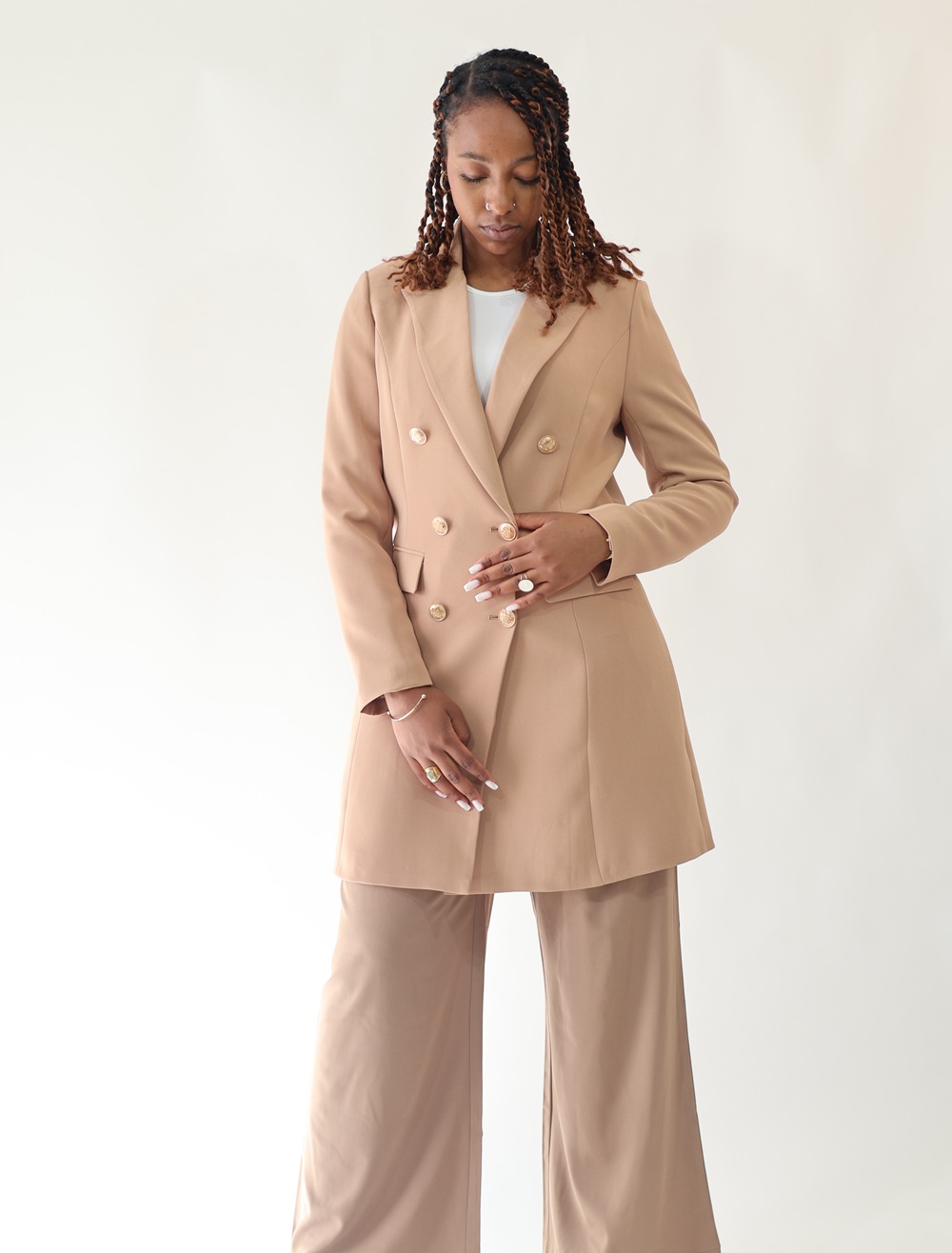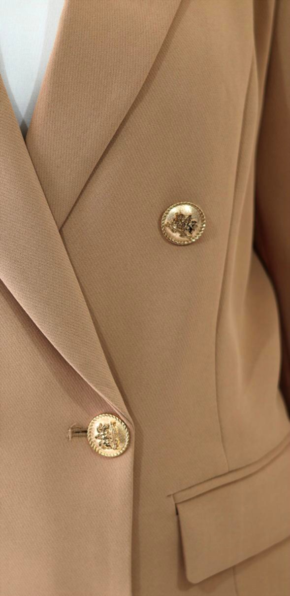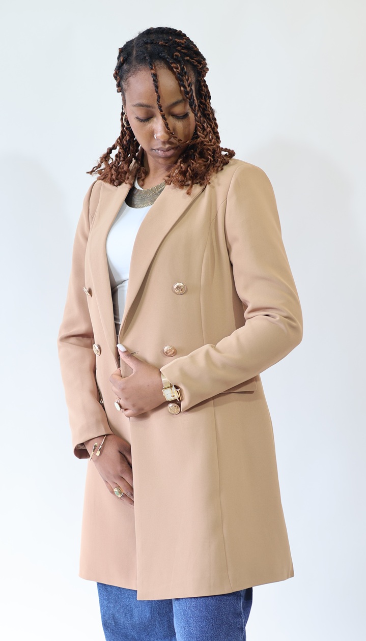Soyez le premier à laisser votre avis sur “Blazer Emmy Beige – Blazer long avec boutons dorés à motifs”