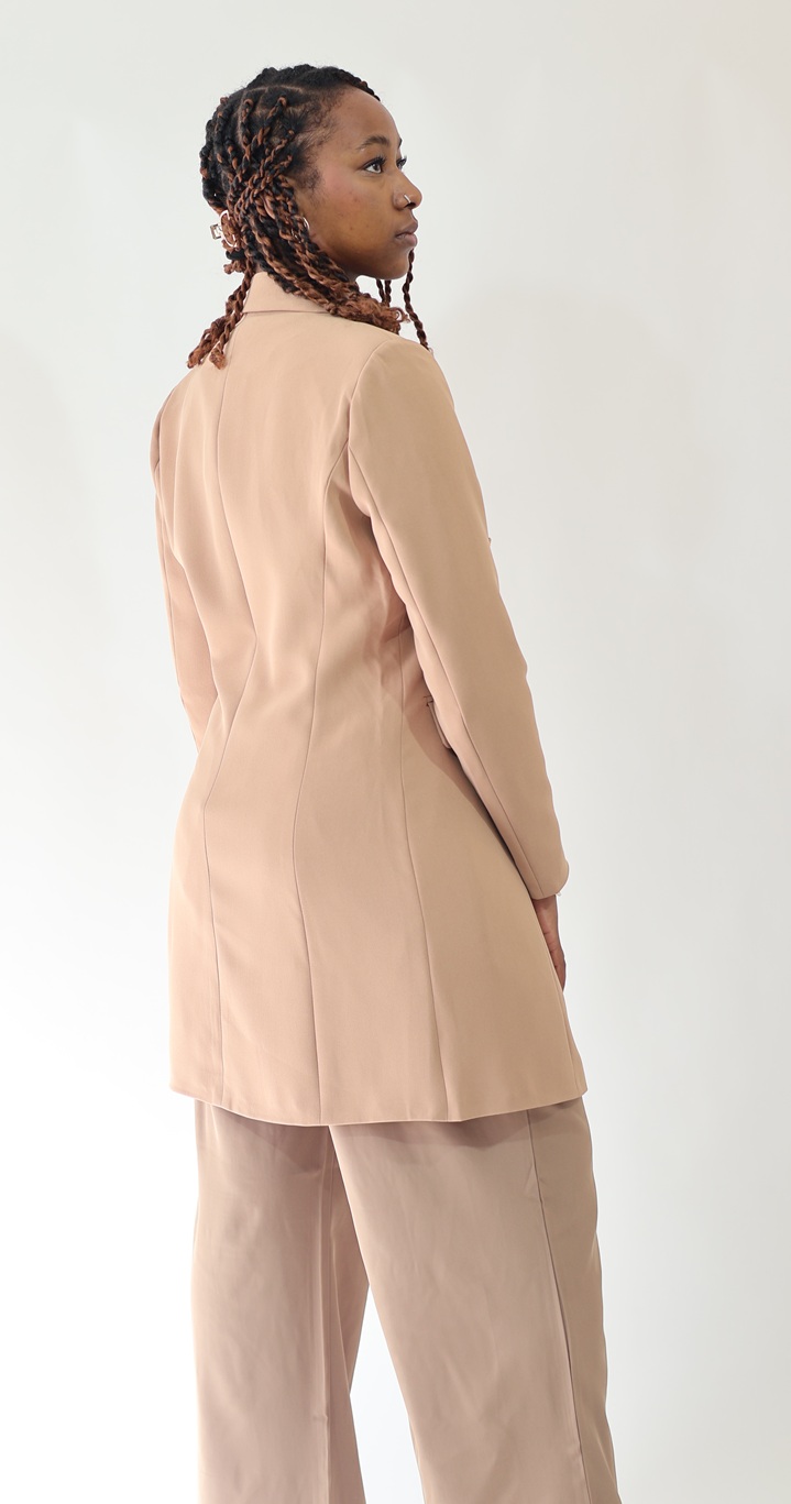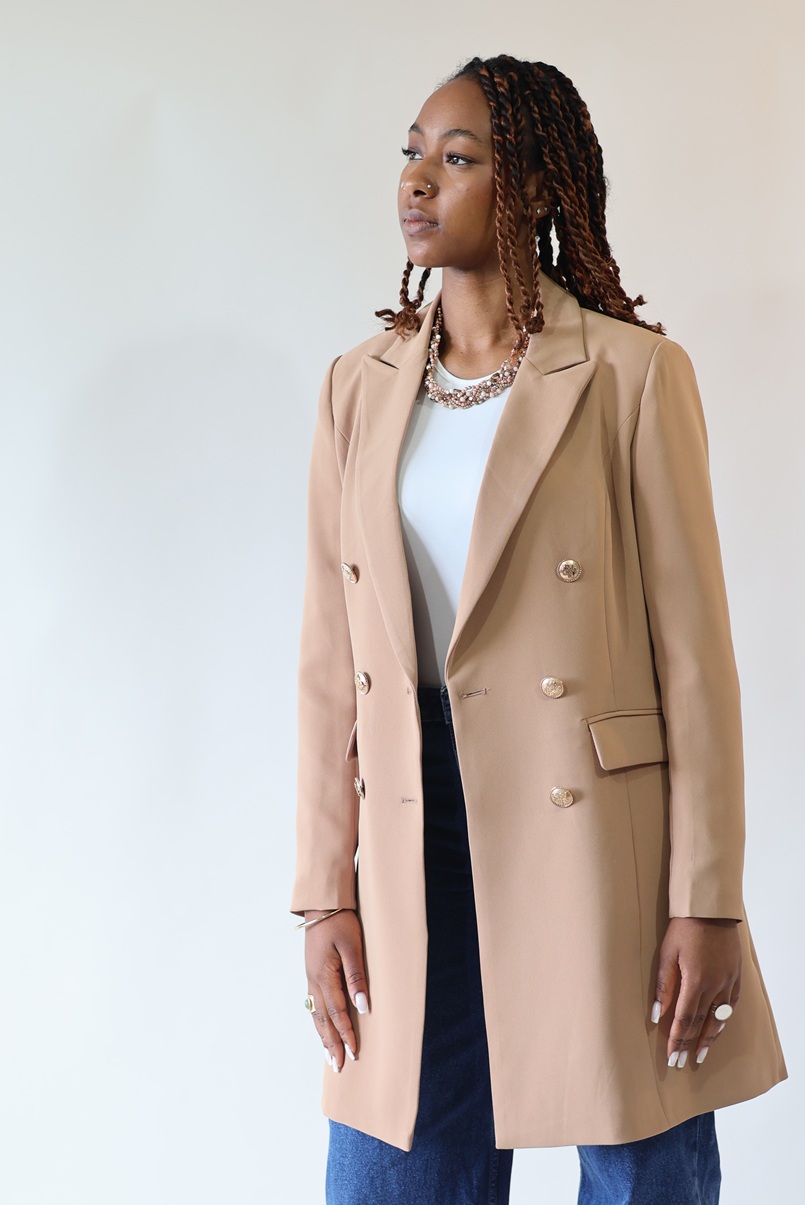 Blazer Emmy Beige – Blazer long avec boutons dorés à motifs