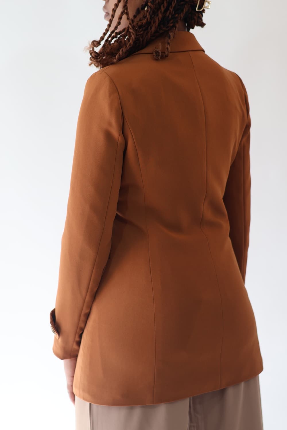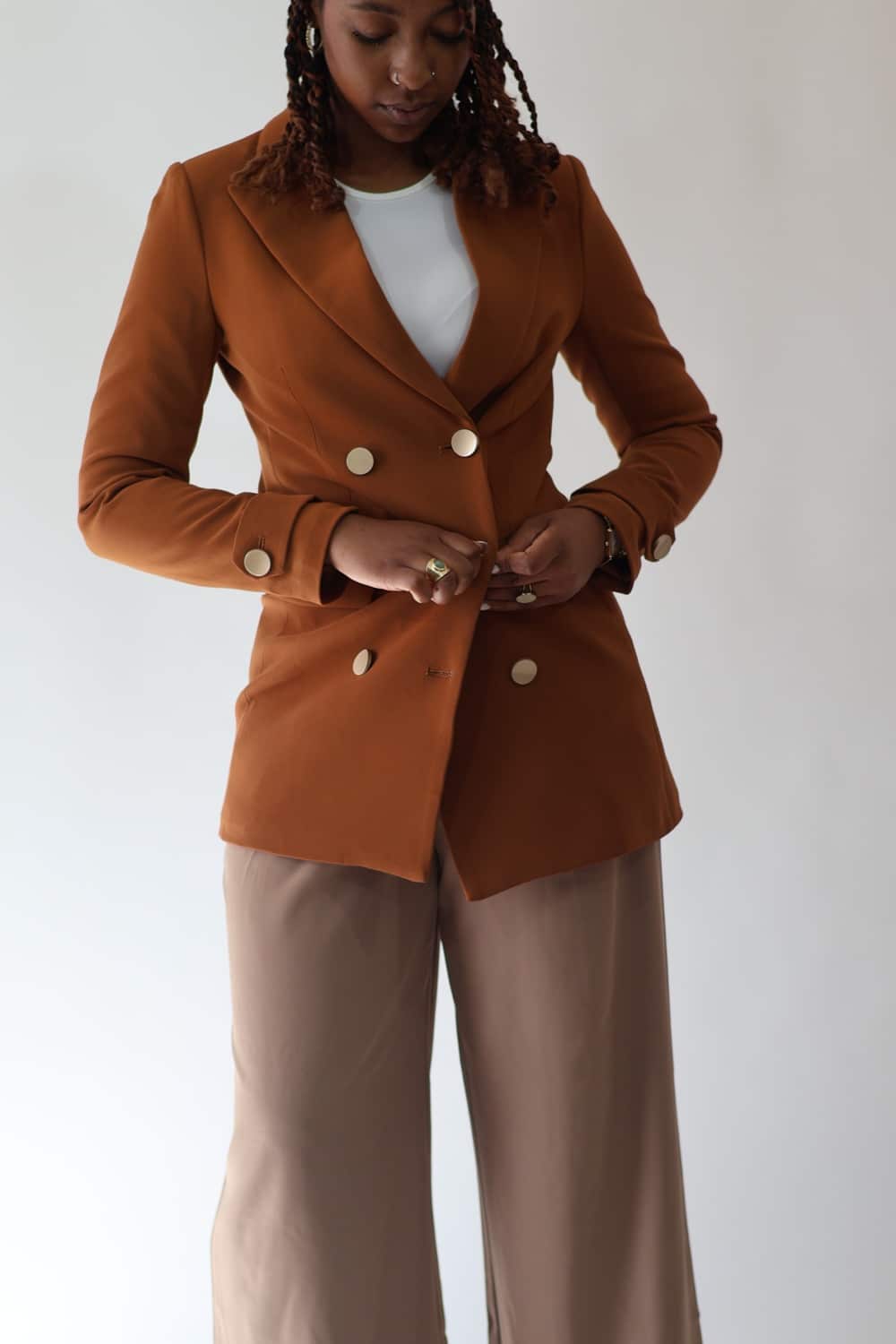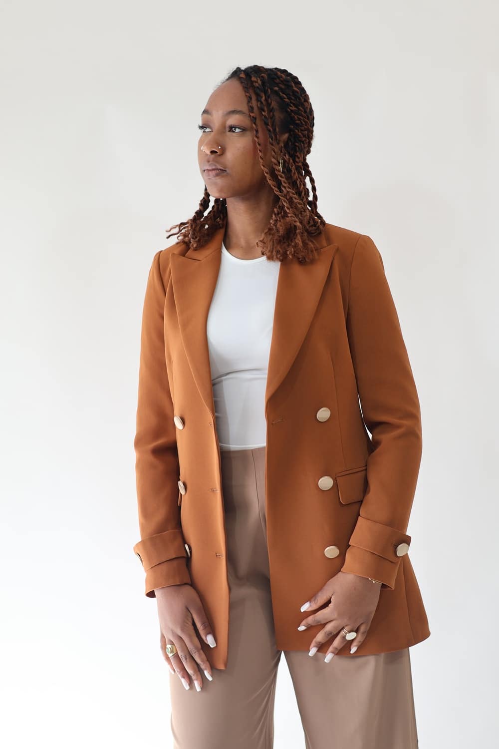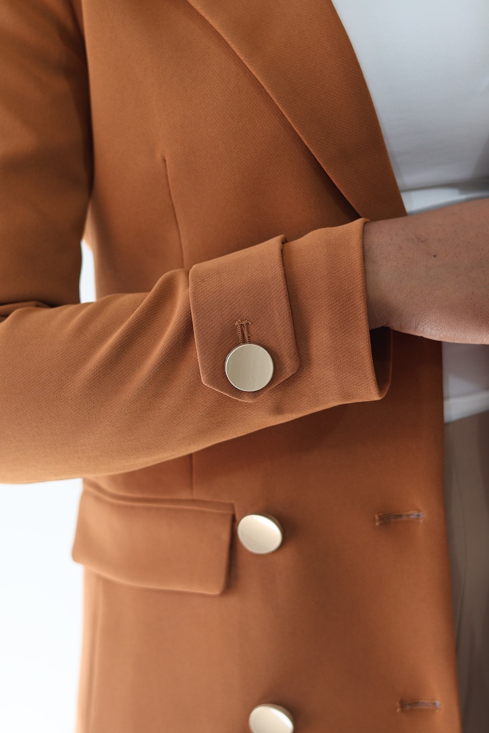 Blazer Oriane Camel – Blazer long double boutonnage, boutons dorés