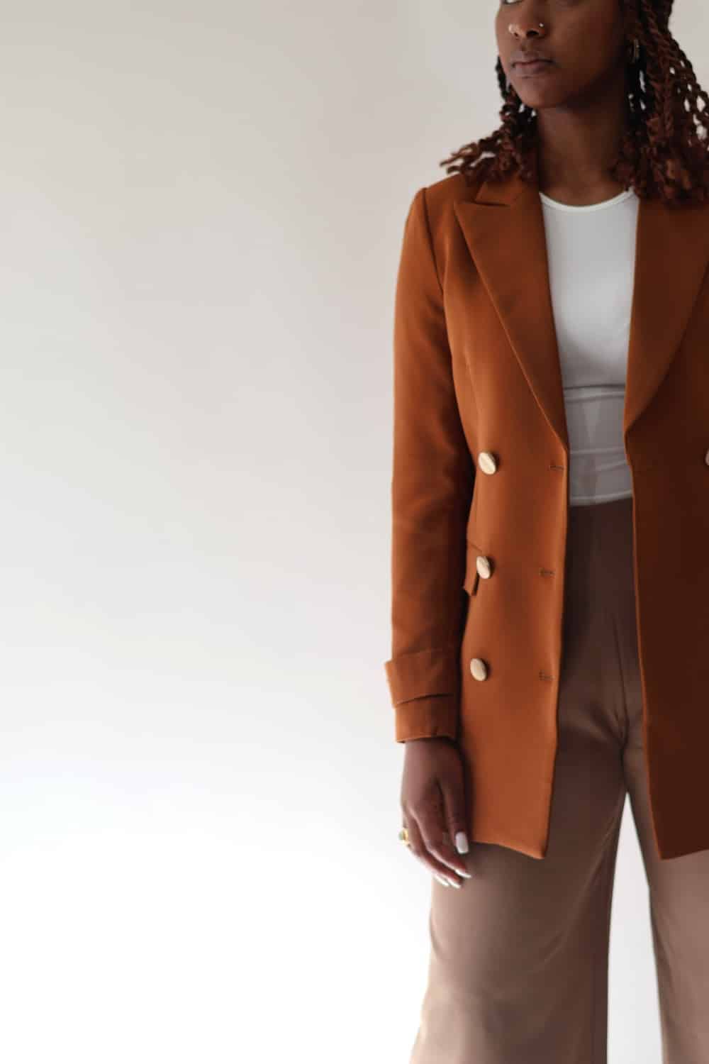 Soyez le premier à laisser votre avis sur “Blazer Oriane Camel – Blazer long double boutonnage, boutons dorés”